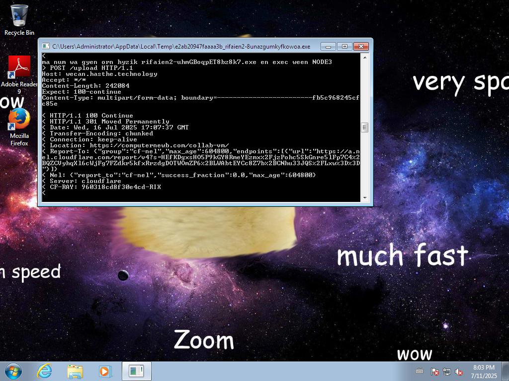 2025-07-11 20:00:44,015 [analyzer] DEBUG: Starting analyzer from: C:\tmpt1gcja 2025-07-11 20:00:44,030 [analyzer] DEBUG: Pipe server name: \??\PIPE\ovUoztEoASeRpomW 2025-07-11 20:00:44,030 [analyzer] DEBUG: Log pipe server name: \??\PIPE\MtQoLjVQzVJdScshTTVJCakrJrxy 2025-07-11 20:00:44,030 [analyzer] DEBUG: No analysis package specified, trying to detect it automagically. 2025-07-11 20:00:44,046 [analyzer] INFO: Automatically selected analysis package "exe" 2025-07-11 20:00:44,328 [analyzer] DEBUG: Started auxiliary module Curtain 2025-07-11 20:00:44,328 [analyzer] DEBUG: Started auxiliary module DbgView 2025-07-11 20:00:44,780 [analyzer] DEBUG: Started auxiliary module Disguise 2025-07-11 20:00:45,000 [analyzer] DEBUG: Loaded monitor into process with pid 508 2025-07-11 20:00:45,000 [analyzer] DEBUG: Started auxiliary module DumpTLSMasterSecrets 2025-07-11 20:00:45,000 [analyzer] DEBUG: Started auxiliary module Human 2025-07-11 20:00:45,000 [analyzer] DEBUG: Started auxiliary module InstallCertificate 2025-07-11 20:00:45,000 [analyzer] DEBUG: Started auxiliary module Reboot 2025-07-11 20:00:45,108 [analyzer] DEBUG: Started auxiliary module RecentFiles 2025-07-11 20:00:45,108 [analyzer] DEBUG: Started auxiliary module Screenshots 2025-07-11 20:00:45,108 [analyzer] DEBUG: Started auxiliary module Sysmon 2025-07-11 20:00:45,108 [analyzer] DEBUG: Started auxiliary module LoadZer0m0n 2025-07-11 20:00:45,233 [lib.api.process] INFO: Successfully executed process from path u'C:\\Users\\ADMINI~1\\AppData\\Local\\Temp\\e2ab20947faaaa3b_rifaien2-8unazgumkyfkowoa.exe' with arguments '' and pid 2604 2025-07-11 20:00:45,453 [analyzer] DEBUG: Loaded monitor into process with pid 2604 2025-07-11 20:00:45,467 [analyzer] INFO: Added new file to list with pid 2604 and path C:\Users\Administrator\AppData\Local\Temp\rifaien2-V6yelpXPUdfN8Luz.exe 2025-07-11 20:01:15,592 [analyzer] INFO: Added new file to list with pid 2604 and path C:\Users\Administrator\AppData\Local\Temp\rifaien2-7WoX89291osCO45j.exe 2025-07-11 20:01:45,671 [analyzer] INFO: Added new file to list with pid 2604 and path C:\Users\Administrator\AppData\Local\Temp\rifaien2-92MAENKJpMdS1guK.exe 2025-07-11 20:02:15,750 [analyzer] INFO: Added new file to list with pid 2604 and path C:\Users\Administrator\AppData\Local\Temp\rifaien2-bFNv7iIS9yMxHemN.exe 2025-07-11 20:02:45,905 [analyzer] INFO: Added new file to list with pid 2604 and path C:\Users\Administrator\AppData\Local\Temp\rifaien2-bFz1PUXFTHCrnY9d.exe 2025-07-11 20:03:16,000 [analyzer] INFO: Added new file to list with pid 2604 and path C:\Users\Administrator\AppData\Local\Temp\rifaien2-2yySZqHMK5DgNI3o.exe 2025-07-11 20:03:46,092 [analyzer] INFO: Added new file to list with pid 2604 and path C:\Users\Administrator\AppData\Local\Temp\rifaien2-uhmGBoqpET8bz8k7.exe 2025-07-11 20:04:04,233 [analyzer] INFO: Analysis timeout hit, terminating analysis. 2025-07-11 20:04:05,483 [analyzer] INFO: Terminating remaining processes before shutdown. 2025-07-11 20:04:05,483 [lib.api.process] INFO: Successfully terminated process with pid 2604. 2025-07-11 20:04:05,483 [analyzer] INFO: Analysis completed.